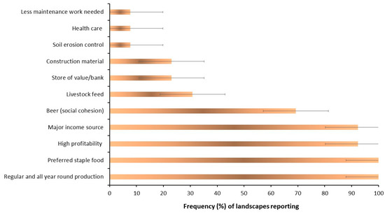 Farmers perceived comparative benefits offered by the banana crop across 13 landscapes in the Eastern Democratic Republic of Congo. Numbers denote percentage of villages reporting.