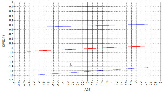 The graph shows that the lower and upper confidence limits of the parameter do not contain the zero value of the moderation effect. It is claimed that there is a positive effect of interaction—with the increase in age of the respondents, there is a stronger positive effect of the burning dimension on the grief of leaving the apartment.