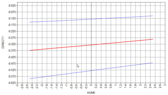 The graph shows that the upper and lower confidence limits of a parameter do not contain a zero moderation effect value. It is claimed that there is a positive interaction effect—with the increase in the number of years of living in the housing estate, there is a stronger positive effect of the combustion dimension on the grief felt over domicile relocation.