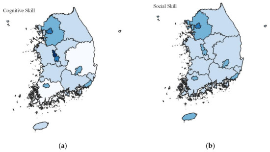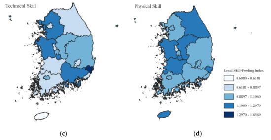 We identify several patterns in the comparative advantages of skill-based local labor pooling. The capital city and adjacent provincial areas of Gyeonggi have an advantage in workforces with cognitive and social skills. The old southeastern industrialized belt, Ulsan and Gyeongnam, and the outskirts of capital areas such as Incheon and Chungnam are specialized in technically skilled workforces. The workforces of planned cities such as Sejong and Daejeon have a relative advantage in cognitive and social skills. Daejeon was designed for developing the science and technology cluster, and Sejong was built for relocating administrative functions from Seoul to Sejong. The less developed provinces and adjacent rural areas of Gangwon, Chungbuk, Jeonbuk, and Jeonnam show higher values in physical skill labor pooling. Jeju, which is specialized in tourism, has a large workforce with social and physical skills.