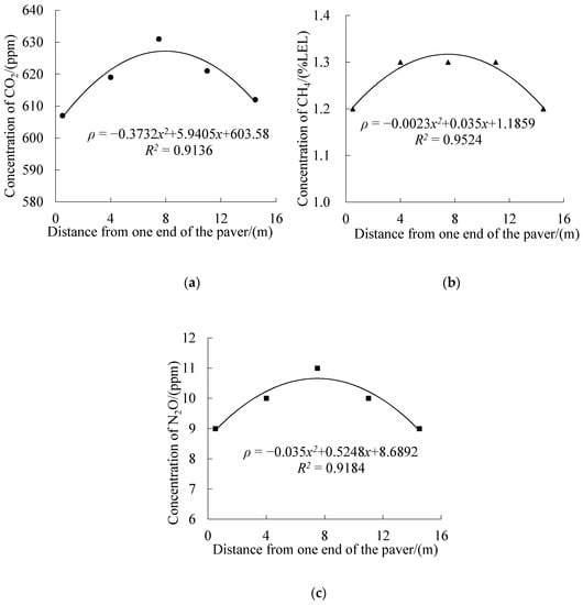 Relationship between gas emission concentration and paver detection points: (a) CO2; (b) CH4; and (c) N2O.