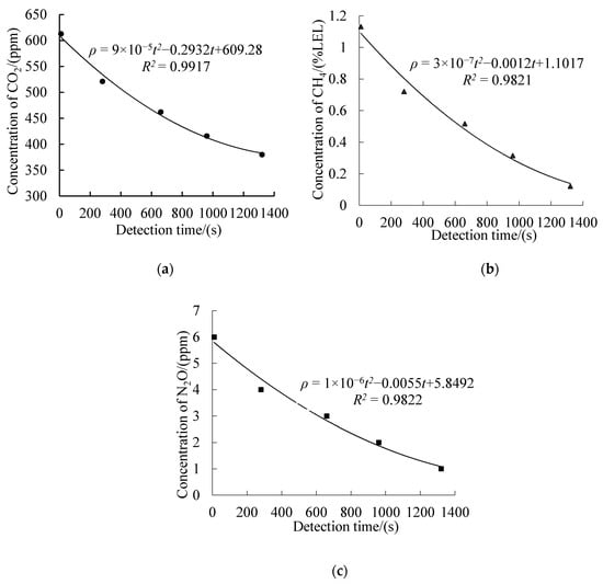 Relationship between greenhouse gas concentration and detection time: (a) CO2; (b) CH4; and (c) N2O.