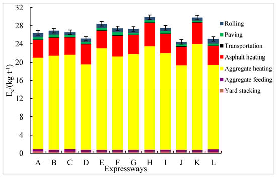 Letters A to L are used to represent the 12 expressways and M represents the energy consumption. The energy consumption generated by yard stacking (M1), aggregate feeding (M2), aggregate heating (M3), and mixing (M5) were obtained through field investigation. Asphalt heating (M4) is calculated as M4 = a × m/1 + a, where a is the asphalt–aggregate ratio and m is the energy consumption when heating 1 ton of asphalt. M6 is the energy consumption of transporting 1 ton of asphalt mixture for 1 km; M7 is the energy consumption of paving 1 ton of asphalt mixture; and M8 is the energy consumption after the application of initial compaction, recompaction, and final compaction to 1 ton of asphalt mixture. The investigation and detection data were calculated by taking the average as the representative value based on standard deviation and variability analysis. The energy consumptions of all of the processes are listed in Table 2.