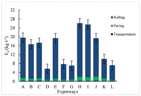 The data in Table 8 show that the carbon emissions from the volatilization of the asphalt mixture in the various processes are different. Among the processes, rolling caused the highest emission, followed by paving, while the emissions of other processes were small (especially in mixing, less than 0.1 kg·t−1, so the Ec of mixing can be neglected). The calculation method of carbon emission from the volatilization of 12 expressways is the same as the Huangyan expressway, and these carbon emissions were obtained by substituting the calculation parameters into the equations. The results are shown in Figure 7.