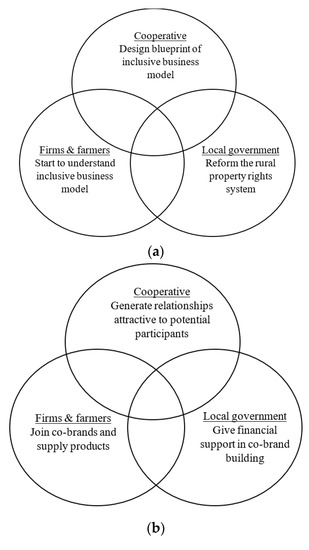 In order to alleviate firms’ and farmers’ doubts, co-op W invited the farmers and firm owners who participated in the early stage of co-branding building to share their experiences. For example, co-op W signed contracts with farmers to pay 30% in the first month for their products, 50% in the second month, and 20% in the third month. Farmers did not have to worry about the selling of products after the products were handed over to co-op W. However, farmers needed to control the quality of their products and ensure the output. There are videos in shopping centers that are broadcasting production and processing of agricultural products and establishing information connections between farmers and consumers. Activities such as exhibitions and consumer trial have been used by the two co-ops to help farmers and firms to display their products in the market system. Additionally, these events have allowed consumers to taste food before buying it and give feedback to producers in real time. The events allowed agents with complementary resources and different capacities to work together, develop the inclusive business model, and implement partnerships [31].