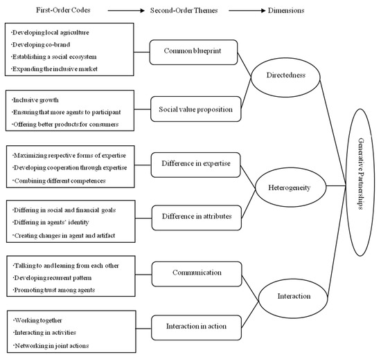 Generative partnerships are hybridized by variant ideas, people, places, and resources that address large social challenges [32]. They are crucial for fostering creativity and innovation among different partners [33] and important for assessing social innovations in the production process [34]. Furthermore, generative partnerships may alter participants’ view about the world, fostering innovation by leading to the emergence of new agents, artifacts, or institutions [33,34] that form a social ecosystem [35,36].