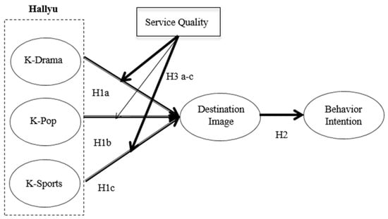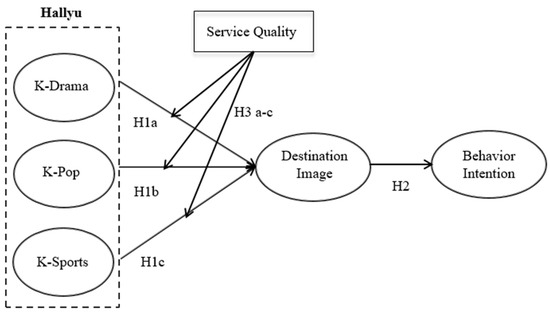 In terms of the effect of service quality at a tourist destination, given its key role in marketing, a market’s service quality plays a critical part in affecting the destination image []. Recognizing that dynamic, several studies have involved investigating the role of service quality in increasing consumers’ perceptions [,,]. We thus considered that service quality could contribute to developing a marketing strategy that can secure a competitive advantage able to attract more customers, both existing and prospective. However, in our literature review, we also found very little research on the relationship of Hallyu and destination image. Based on those understandings and concepts, we formulated a series of hypotheses: