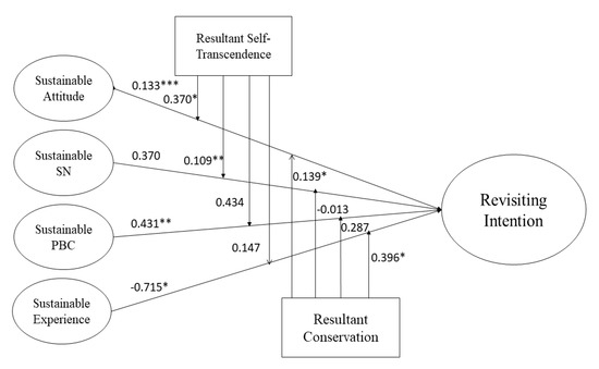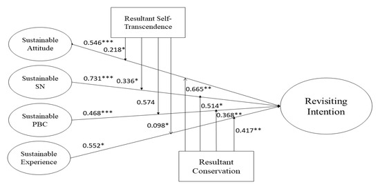 The next set of hypotheses is related to the moderating effects of Schwartz’s bipolar dimensions between STPB factors, SE, and revisiting intentions. We checked for the moderation of metric variables through interaction effects using SPSS. In this procedure, we examined for the main direct effects of the independent variables on dependent variables (Table 5). We performed this analysis separately for both bipolar dimensions (resultant self-transcendence and resultant conservation). First, the direct effect of SATT on RVI is statistically significant for both samples (UK = 5.557, p < 0.05; CN = 4.454, p < 0.05), and the interaction effect between SATT and resultant self-transcendence (RST) (SATT × RST) on RVI is also statically significant in both data groups (βUK = 0.218 **, p < 0.01; βCN = 0.370 **, p < 0.01). Thus, H5a is accepted. Likewise, we also found significant interaction effects of SSN and RST on RVI for both samples (βUK = 0.336 *, p < 0.05; βCN = 0.109 **, p < 0.01). Therefore, H5b is also supported. On the other hand, the moderation for SPBC has not been achieved for both samples (SPBC: βUK = 0.574, p > 0.05; βCN = 0.434, p > 0.05); hence, we reject H5c. By contrast, the interaction of SE and RST (SE × RST) was also proven significant in the UK sample (SE: βUK = 0.098 *, p < 0.05) but insignificant in the Chinese sample (βCN = 0.147, p > 0.05), so we partially accept H5d. We repeated the same process to examine the interaction effects of STPB, SE, and resultant conservation. We checked the main direct effect of resultant conservation on revisiting intentions, which were found to be significant in both samples (UK = 9.734, p < 0.05; CN = 13.864, p < 0.05). The moderation of SATT and resultant conservation (RC) (SATT × RC) has a positive significant effect on revisiting intentions (βUK = 0.665 **, p < 0.01; βCN = 0.139, p < 0.05). Therefore, we accept H6a. Moreover, the interaction of SSN with RC is significant in the UK sample (βUK = 0.514 *, p < 0.05), but we found it to be insignificant in the case of the Chinese sample (βCN = −0.0113, p < 0.05). Therefore, H6b is partially accepted. Likewise, a significant interaction effect was obtained for SPBC in the UK (βUK = 0.368 **, p < 0.01), while the interaction of SPBC was insignificant in China (βCN = 0.287, p > 0.05). H6c is partially accepted. Finally, the interaction effect of sustainable experience with resultant conservation was also found to be significant (βUK = 0.417 **, p < 0.01; βCN = 0.396 *, p < 0.05). Thus, we accept H6d.