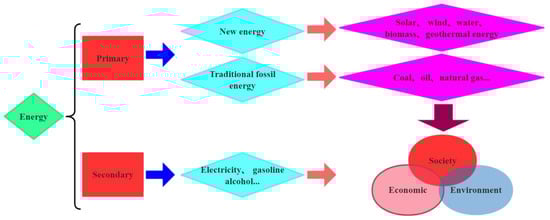 What is the definition of energy? What are the classifications of energy? Generally speaking, energy refers to the general name of materials that can produce various kinds of energy or work, and can be divided into primary energy and secondary energy (Figure 1). Primary energy includes traditional fossil energy and new energy. Coal, oil, and natural gas are the core of traditional fossil energy and the foundation of global energy. New energy refers to various forms of energy other than traditional fossil energy, including those that are being developed and utilized, but have not yet been commonly used, such as solar, wind, geothermal, ocean, and biological energy, etc., which are the new directions of global energy development in the future and also the focus of this paper. Secondary energy refers to the direct or indirect conversion of primary energy into other types and forms of energy resources. The secondary energy is not analyzed as it is not in the scope of this paper.