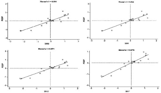 Local spatial autocorrelation is an important method for testing the spatial correlations of different provinces in the study area, and is often presented in the form of a Moran’s I scatter plot. In this study, Moran’s I scatter plots are chosen with significant representative features in 2002, 2007, 2012, and 2017 (Figure 2). In Figure 2, it is shown that, although the 21 developing provinces in China have obvious agglomeration correlation characteristics in the development of new energy, they also obviously have non-equilibrium characteristics in terms of internal spatial distribution. Most provinces are located in the first and third quadrants, with obvious high–high and low–low correlation characteristics.