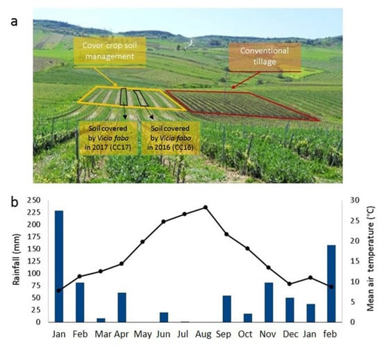 (a) Vineyards selected for the study; (b) monthly rainfall (blue histograms) and monthly average temperature (black dots) from January 2017 to February 2018.