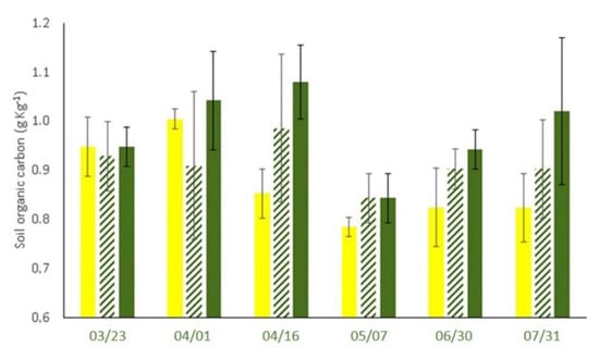 Soil organic carbon (g kg−1) under cover crop 2017 (green histograms), cover crop 2016 (green stripes) and conventional tillage soil management (yellow histograms). Bars indicate standard error (n = 5).