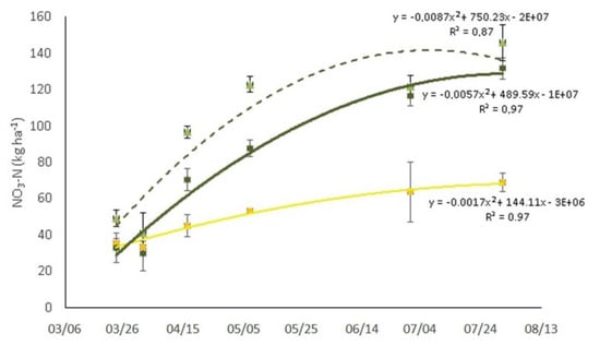 Soil nitrate content (kg ha−1) under cover crop 2017 (green line), cover crop 2016 (green dotted line) and conventional tillage (yellow line) management. Bars indicate standard error (n = 3).