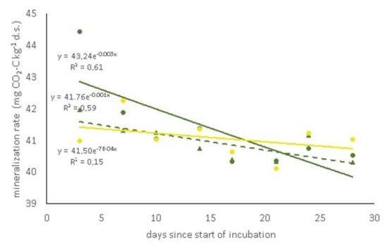 The C mineralization rate exponentially decreased in CC16 and CC17, whereas it remained constant in CT during the incubation period (Figure 4 and Table 1). Such a stimulation, confirmed by higher biological available C and total C mineralized and lower mean residence time (MRT), was evident in CC17 since the soil under this management was covered by Vicia faba during the sampling year (Table 1).