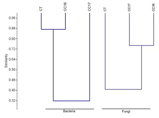 Fungal diversity indices, in fact, were higher in CT and tended to be reduced by the presence of cover crops; conversely higher bacterial diversity was detected in CC soil compared to CT. A cluster analysis based on the F-ARISA profiles separated the fungal communities of the CC16 and CC17 soils from that of the CT soil. Conversely, with regard to bacteria (B-ARISA), the CC16 and CT communities grouped together while the CC17 was clustered apart (Figure 5).
