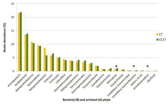 At the phylum level, both CC17 and CT soils were dominated by Actinobacteria (CC17 21.59%; CT 21.90%), Acidobacteria (CC17 13.54%; CT 13.88%), Alphaproteobacteria (Proteobacteria were subdivided into subphyla, CC17 10.88%; CT 10.4%), Bacteroidetes (CC17 9.44%; CT 9.42%) and Betaproteobacteria (CC17 8.7%; CT 5.88%), whose total abundance encompassed 64% and 61.5% of the whole sequences for CC17 and CT, respectively. Other less represented phyla (<5%) were Firmicutes, Chloroflexi, Gemmatimonadetes, Deltaproteobacteria, Verrucomicrobia, Gammaproteobacteria and Thaumarchaeota (Archaea). About 6% of the sequences resulted unknown (Figure 6). Interestingly, NGS revealed some differences among the less abundant phyla, namely Nitrospirae, Candidatus Saccharibacteria and Armatimonadetes (Figure 6).