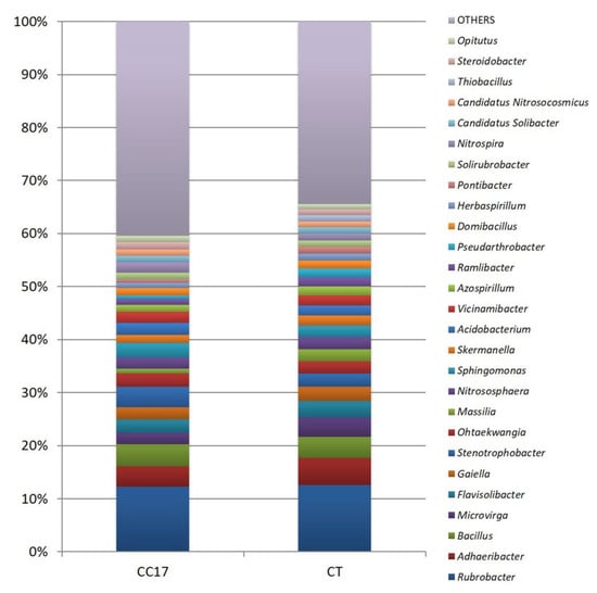 Relative abundance of identified genera in the total bacterial communities of CC17 and CT soils. Only identified genera >0.5% are included. CC and CT assemblages include 53.9% and 53.7% of unknown sequences that are not included in the graph, respectively. OTHERS includes all of the other less abundant genera (<0.5%).