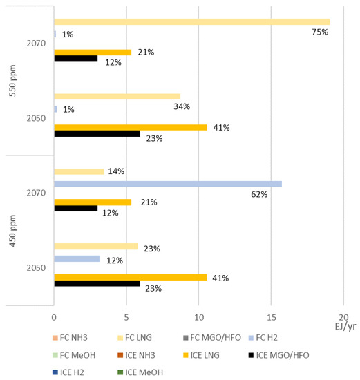 Fuel volumes (in EJ/year) for different fuel/powertrain combinations in cost-effective fuel choices for shipping in 2050 and 2070 for the two climate scenarios 450 and 550 ppm. The share of different fuel options of the total fuel use for shipping (in percentage) in the four cases are presented at the end of each bar. FC, fuel cells; ICE, internal combustion engine; MGO/HFO, conventional fossil oil; LNG, liquefied natural gas; NH3, ammonia; H2, hydrogen; MeOH, biofuels, fossil MeOH, and electro-methanol.