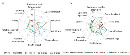 The weights of the different criteria applied in this study are based on Hansson et al. [9] and Månsson [48]. These weights were settled during a workshop with a group of shipping related stakeholders. The stakeholders included ship-owners, engine manufacturers, fuel producers, Swedish government authority representatives, and relevant researchers.