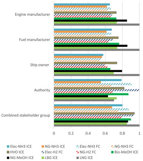 Ranking of the studied marine fuels for the combined stakeholder group and for the different stakeholder groups. The value “1” is assigned to the fuel ranked the highest and the values for the other fuel are expressed relative to the fuel ranked the highest.