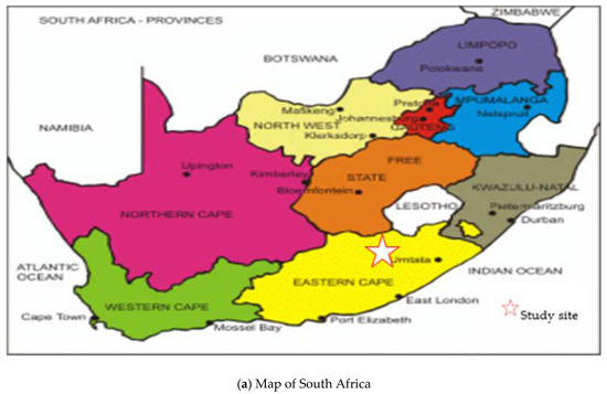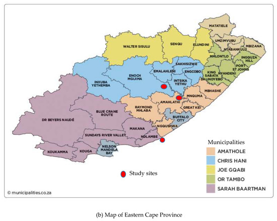 The study was carried out in the Chris Hani and Amathole district municipalities in the Eastern Cape Province of South Africa. Three local municipalities were selected based on their agricultural activities: Emalahleni, Intsika Yethu and Ngqushwa. Emalahleni and Intsika Yethu are situated in the former Transkei, while Ngqushwa is situated in the former Ceskei homelands. The Qamata and Tyhefu irrigation schemes were chosen because they are considered to be among the largest small-scale irrigation schemes involved in crop production and still operating in the selected local municipalities. Farmers grow a variety of crops, including field crops and vegetables such as maize, cabbage, potatoes, butternut, carrots and spinach. Maize is the staple crop among the black population, and cabbage is the most frequently consumed vegetable. In addition, the irrigation schemes were found to be suitable for the study because they are located in different former homeland areas with characteristics that are representative of the dominant conditions in the province. Such an analysis is crucial for determining the stages of development for each scheme. The former Transkei and Ciskei are predominantly associated with poverty and high unemployment levels [38]. The former Transkei represents a more rural environment, while the other incorporates urban and peri-urban environments, with corresponding occupational patterns. There are significant historical differences between the two areas; hence, this allows for a comparative analysis. The study areas also allowed for the representativeness of the sample in terms of the production technologies since they include farmers who participate in irrigation and those practising home gardening. Figure 1a,b show maps of South Africa and the Eastern Cape Province, respectively.