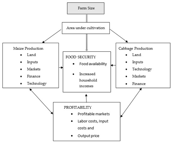 Figure 2 gives the conceptual framework, highlighting the importance of land in crop production. Farm size determines the area under crop production. Land allocation towards crop production is driven by the objective to feed households and make profits through the sale of surplus on the market. Households that do not participate in markets consume all their produce, thereby alleviating household food shortages. Through market participation, households can sell their marketable surplus and earn additional income. An increase in disposable income enhances a household’s access to other food types, consequently improving nutritional status. Farmers can also invest their profits in their farm business through innovations and new technologies, thereby enhancing productivity.