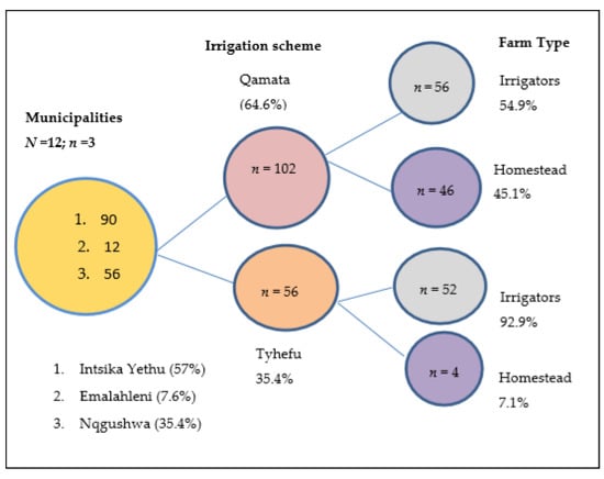 The data were obtained by means of a multistage sample survey conducted in the Eastern Cape province of South Africa. The Eastern Cape is one of the poorest provinces in South Africa and relies on staple crop production for food security, particularly in the rural parts. Three municipalities were chosen because they have suitable characteristics such as crop farming and irrigation. Purposive sampling was also used for selecting the specific study sites. Qamata and Tyhefu are both established irrigation schemes undertaking crop production. The unit of analysis was the household, and 158 households were selected using random sampling. Figure 3 presents the process of sample selection and composition.
