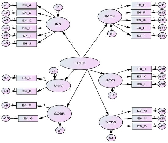 Initially, an EFA was carried out to identify the number and composition of the underlying constructs, to explain the common variance of the set of variables analysed. This is because the EFA assumes that the observed variables are reflective measures of a certain number of common constructs or latent variables [82,83]. However, the EFA does not allow defining the incidence of each variable in the measurement of each construct nor the relations that can exist between the obtained constructs. To do this and to complete the verification of the reliability of the variables and constructs as well as their consistency, the CFA is used, since it allows us to define, among other things, the relationships between the constructs, which in turn will permit us to confirm or refute the hypotheses raised. In this sense, it can be said that the EFA is used to build the theory and the CFA to confirm it. Ferrando and Anguiano-Carrasco [84] define both analyses as the two poles of a continuum. For this reason, we begin with an EFA that builds the theory of the dimensions of the innovation objectives in sustainability. This is then confirmed, along with the relationships between these constructs and the Triple Helix construct, by means of a CFA.