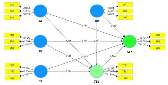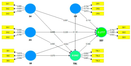 Table 2 indicates that the construct reliability and validity values between each variable are relatively meeting the threshold levels. Therefore, it can be concluded that the data do not contain any multicollinearity problems in the model. The highest Cronbach’s alpha value was in TBL (0.887), followed by SEI (0.823), SN (0.820), SA (0.816), and SB (0.685) and lowest was recorded in OR (0.619). For the reliability testing, the results show the composite reliability values of SEI (0.896), OR (0.796), SA (0.886), SN (0.892), SB (0.821), and TBL (0.929), which indicate that the data used in this research model are a good representation and the indicators are valid and reliable measurements.