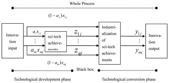 Meanwhile, when the above literature measures the innovation efficiency of China’s high-tech industries, a decision making unit (DMU) is considered a “black box”, and these studies only consider the external characteristics of the DMU, ignoring its internal structure. Therefore, the result has some deviations and does not reflect the real situation of high-tech industries. Fare and Grosskopf proposed a network DEA, decomposed the DMU into a “gray box”, found the inside efficiency of the production process while evaluating the DMU’s overall efficiency, and enhanced the separability of the evaluation results []. Since then, many scholars have begun to study the production process with a two-phase structure.