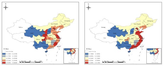This paper uses DEA-solver 6.0 to estimate the innovation efficiency of high-tech industries from 29 Chinese provinces from 1999 to 2018. Table 1 lists the results, and the value of and are expressed on the maps shown in Figure 2.