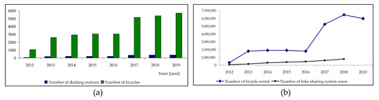 Figure 1. Characteristics of the Veturilo system in Warsaw in 2012–2019; (a) number of docking stations and bikes; (b) number of bike-sharing systems users and bikes rental. Source: Own research based on data presented in [76,77,78,79].