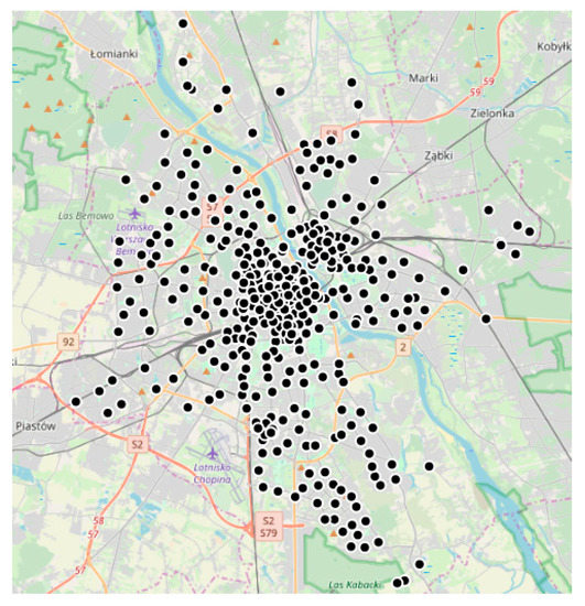 Figure 2. Locations of the Veturilo system stations in Warsaw. Source: Own research based on data presented in [64,76,78,79].