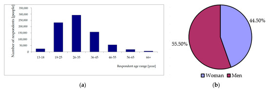Figure 3. (a) Age structure; (b) sex structure of people using Veturilo in Warsaw in 2018. Source: Own research based on data presented in [77].