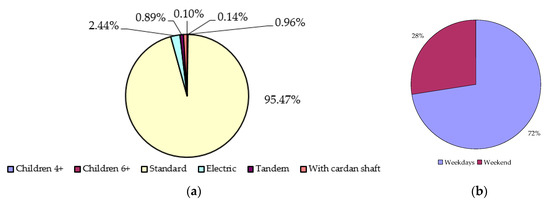 The obtained data also made it possible to state that in 2018 standard bikes were the most often rented (95.5%) and the least often rented were bikes for children 4+ (which was 0.1% of all rentals—i.e., 5821 rentals)—see Figure 4a. In turn, Figure 4b presents data on bike rentals on weekdays and weekends. A total of 72% of all rentals took place on weekdays. In the analyzed period, this was the majority of all rentals. On weekdays, the bikes were rented on average 22,150 times a day. Weekend rentals were 28% of all rentals.