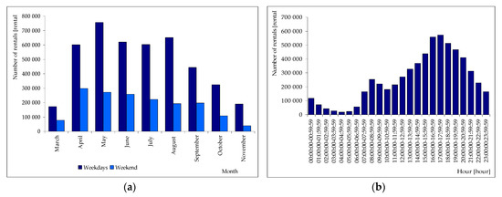 Figure 5. The number of bike rentals from the Veturilo system in Warsaw in 2018; (a) from March to November on weekdays and weekends; (b) at particular hours of the day. Source: Own research based on data presented in [77].