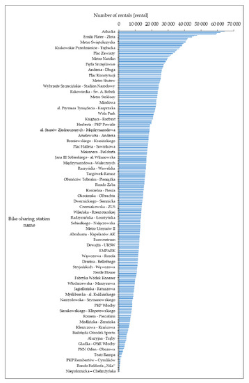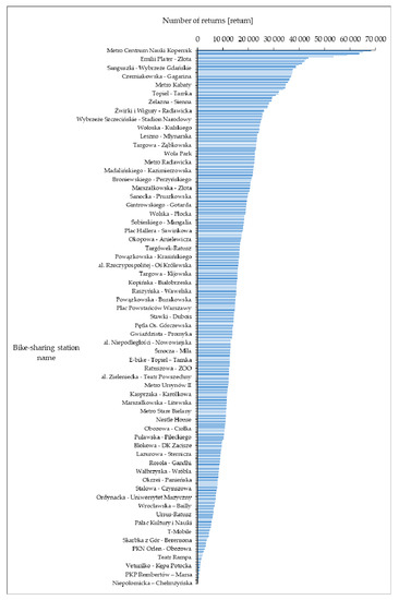 Figure 6 and Figure 7 present the number of bike rentals and returns on particular stations. The most bikes were rented from the stations Arkadia, Plac Wileński, Metro Centrum Nauki Kopernik, and Al. Niepodległości-Batorego, whereas the least were from the stations Komandosów-Niedziałkowskiego, Paderewskiego-Dziewanowska, Frontowa—Czerwonych Beretów, PKN Orlen-Wydawnicza, and Niepołomicka-Chełmżyńska.