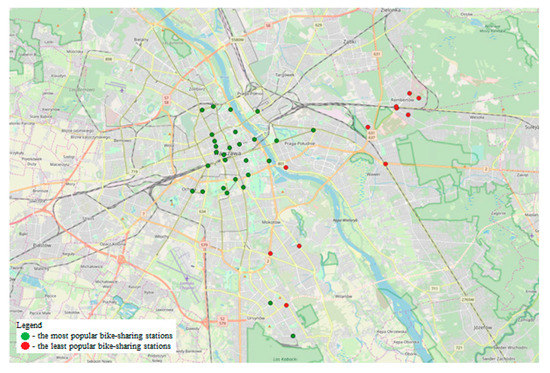 Figure 8. The bike-sharing stations; (green) the most popular among users; (red) the least popular among users in 2018. Source: Own research based on data presented in [77].