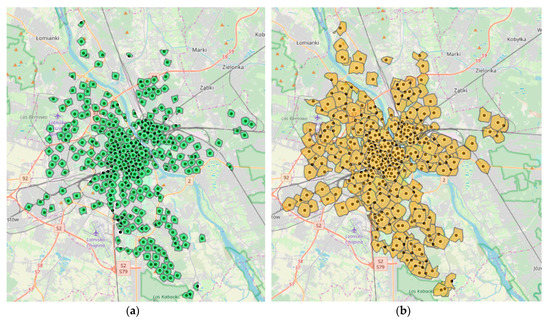 Figure 9. Pedestrian access to the bike-sharing station in Warsaw; (a) on the assumption of an average travel time of 5 min to the station; (b) on the assumption of an average travel time of 10 min to the station. Source: Own research based on data presented in [77].