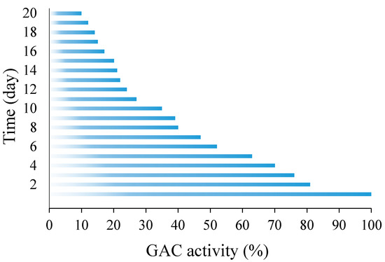 where (mg/L) and (mg/L) are the concentrations of metals in the solution before and after adsorption, respectively. is the volume of solution (L) and is the mass of sorbent (g). The ratio of calculated adsorption capacity for each day to the adsorption capacity for fresh carbon (100%) shows the level of GAC activity. Figure 1 shows the level of GAC activity on different days. The GAC activity was calculated according to the following equation: