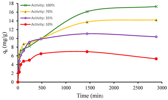 Outcomes of the modeling demonstrated that the pseudo-second-order model has the highest correlation of determination (R2) for Hg adsorption onto GAC surfaces for 10% and 35% activities while the chemisorption model was fitted to the data at 70% and 100% activities. These results suggest that the rate-limiting step may be chemical adsorption involving valent forces, i.e., through sharing or the exchange of electrons between the adsorbent and divalent metal ions [27] at 10% and 35% activities. Additionally, for 70% and 100% activities, the chemisorption mechanism (formation of a chemical reaction between the surface and the adsorbate) leads to Hg adsorption onto the GAC surface. This phenomenon could be due to the fact that most free sites were occupied by contaminant components in the low-activity GAC. The initial sorption rate (h0, expressed in mg/g×min) can be obtained when t approaches zero, based on Equation (7):