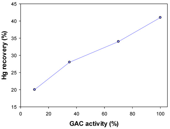 As was expected, analyses indicated that fresh GAC (100% activity) has the highest Au and Ag adsorption. While after 48 hours GAC with 10% activity adsorbed 1.33 mg/g Au, fresh GAC adsorbed 1.75 mg/g Au (a 24% increase). This increase was 43.6% for Ag adsorption (0.972 and 1.724 mg/g for 10% and 100% GAC activity, respectively). Figure 2 shows the Hg adsorption (based on Equation (1)) onto the surface of GAC with different activities at various times. These results indicate that increasing the activity can increase Hg adsorption. The Hg loading on the GAC with 10% activity is 5.33 mg/g, while it is 17.29 mg/g for the GAC with 100% activity. These variations show that Hg adsorption was increased by 224% by increasing the GAC activity from 10% to 100% and that the Hg recovery significantly increased (Figure 3). Generally, the laboratory results illustrated that the kinetics of adsorption are very fast during the initial minutes while they dropped significantly after a few minutes. This phenomenon occurs due to a large number of sites on GAC surfaces that are available for adsorption at the initial stage of the process [26].