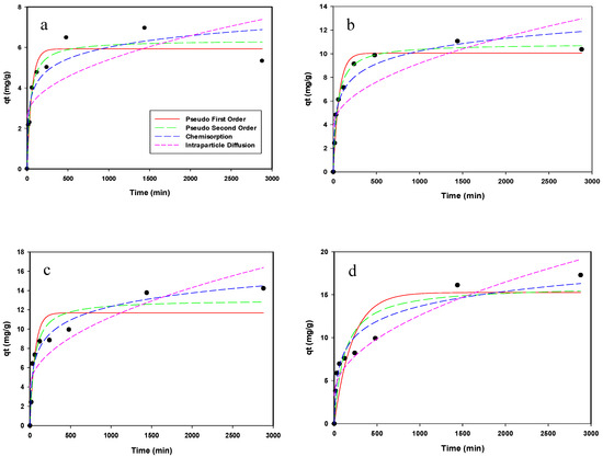 Four different models, including pseudo-first-order, pseudo-second-order, chemisorption, and intra-particle diffusion models, were fitted to the laboratory data (Figure 4). The calculated parameters for each model are listed in Table 2.