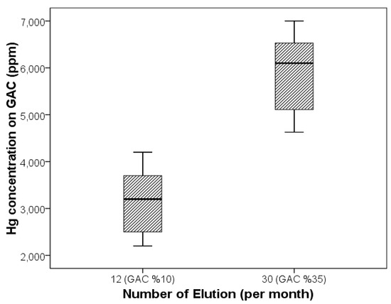 GAC activity at the industrial scale can be controlled by changing the frequency of carbon elution and steam-activation in the kiln. The adsorption unit in the “Pouya Zarcan Agh-Darreh” plant (with 7 tanks) works in a countercurrent format, which means that the last tank in the circuit has the highest GAC activity level and that the first tank has the lowest level. The first tank was selected to study the effect of GAC activity on an industrial scale because, as mentioned, the plant works in a countercurrent format, and the concentrations of metals in this tank are significantly higher than those in other tanks. Regular sampling (a 5 g sample every day) from this tank was conducted to calculate the GAC activity. To take samples, a bottle roll was turned off every day for a short time, and the carbon was withdrawn using a screen. The size of the screen was 800 µm. An amount of 5 grams of carbon was taken and the rest was returned to the bottle. Investigation of the plant indicated that by increasing the frequency of elution from 12 to 30 times and the number of steam-activations from 6 to 15 per month, the activity increased from 10% to 35% in the tank. In an elution event, 6.3 t of GAC is removed from this tank (the volume of the elution cell equals 6.3 t of GAC) and sent to the kiln after elution (more than 30 hours). In order to study the effect of GAC activities, the concentration of Hg was measured in the samples before and after increasing the activity.