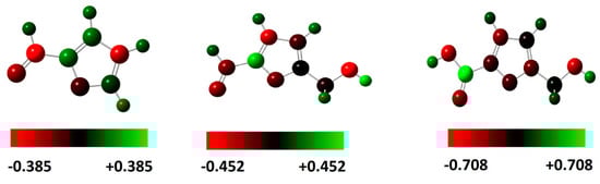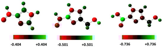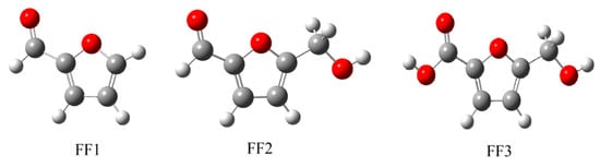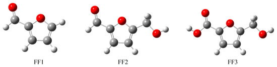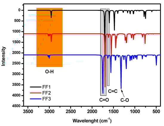 In order to highlight the functional groups in FF1, FF2 and FF3, the vibrational spectroscopy of all molecules was calculated using the B3LYP/6-31++G(2d,p) method (Figure 3). The vibrational spectra of FF1, FF2 and FF3 confirmed the existence of aldehyde, aldehyde and alcohol and carboxylic acid and alcohol, respectively. The peaks at around 3000 cm−1 are mainly attributed to hydroxyl groups. Moreover, the peaks at 1705, 1698 and 1745 cm−1 are attributed to carbonyl groups.