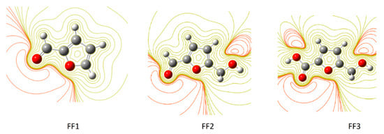 By using ESP maps, it is possible to visualize the electron distribution, and therefore identify the centers or the areas of their concentration in each compound [63]. The contour maps of electron density reveal that oxygen atoms on the studied molecule inhibitors exhibit favorable interaction sites, taking into account the difference between the oxygen atoms in the functions and the other atom. The oxygen atoms, in this case, exist in the formyl group of FF1, in the formyl and hydroxyl groups of FF2 and in the hydroxyl and carboxylic groups in FF3. Interaction sites surrounded by a dark red contour contribute to form the bonding interactions between metal surfaces and inhibitors [13]. The dark red color in the contour map of negative potential particularly surrounds oxygen molecules and its regions in FF1, FF2 and FF3 molecules in gas and aqueous phases, whereas the green color is scattered in the positive potential region according to the contour representation of electrostatic at the DFT/B3LYP/6-31++G(2d,p) calculation level (Figure 4). Similar geometries were obtained in the aqueous phase (Figure 5).