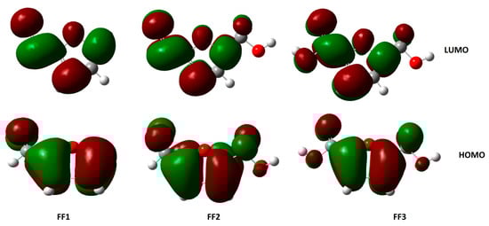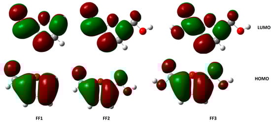 The highest occupied molecular orbital (HOMO) and the lowest unoccupied molecular orbital (LUMO) of a chemical molecule are very important in defining its reactivity [64,65]. Figure 6 and Figure 7 represent the HOMO and LUMO orbitals of the studied compounds in gas and aqueous phases, respectively. The compounds FF1, FF2 and FF3 present a clear contribution of ρ-orbitals at the cyclical level (furan ring), consisting of an aromatic ring with five atoms, including one oxygen atom.
