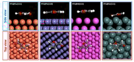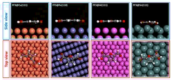 The adsorption behaviors of FF1, FF2 and FF3 derivatives were conducted using Monte Carlo simulations on the Cu(111), Fe(110), Al(111) and Sn(111) surfaces. To perceive the equilibrium adsorption configuration of the studied molecules on the metals’ surfaces, Figure 10, Figure 11 and Figure 12 show how FF3, FF2 and FF1 could be adsorbed on the Fe(110), Cu(111), Al(111) and Sn(111) surfaces via two different views. From the side view, all inhibitor molecules are found to be parallel on the Fe(110), Cu(111) and Al(111) surfaces and quasi-parallel in the case of the Sn(111) surface. From the top view, all molecules are flat on the metal surfaces.