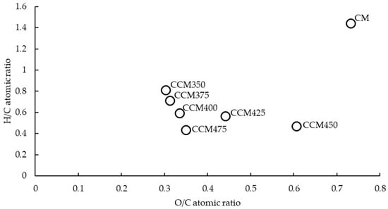 | Elemental Composition (%) | Atomic Ratios | Recovery with Respect to the Un-Carbonized CM | |||||||||||