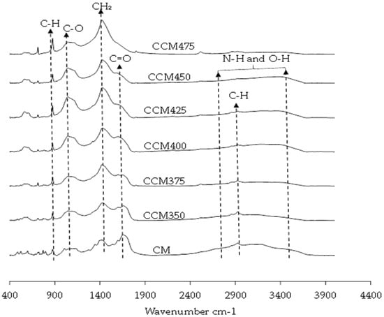 - Decreased C=O band on the surface of CM with increasing temperature.